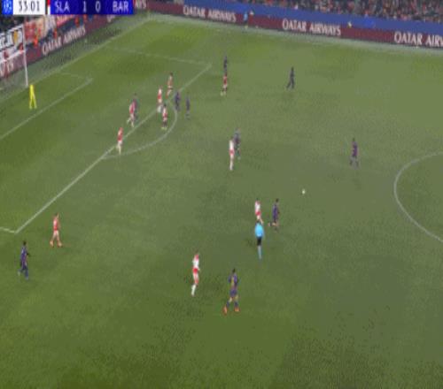 第34分钟,德容直塞,费尔明小角度抽射破门,巴萨1-1布拉格斯拉维亚